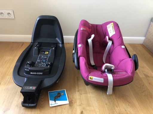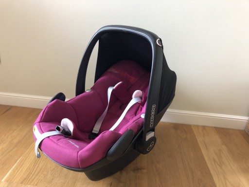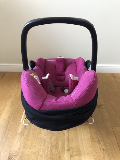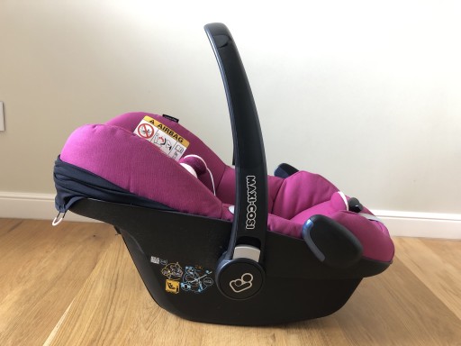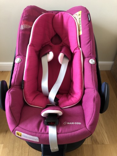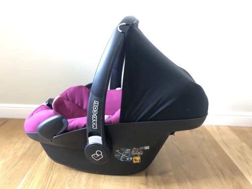 Сидіння витримує 0-13 кг Maxi Cosi Pebble Plus, а також базу Isofix і вкладиш для новонароджених. Встановлюється обличчям проти напрямку руху. Темно-коричневий колір. Дуже практична, досить легка, дитина в ній не потіла і приємно спала в дорозі.