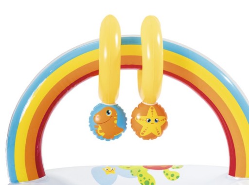 Переносний надувний пеленальний столик відмінно підійде для подорожей, на пляж або в далеку подорож. Це забезпечить комфортне та легке переодягання малюка. У складеному вигляді він легкий і не займає багато місця в сумці, його можна брати практично куди завгодно. Пеленальний столик виготовлений із твердого, перевіреного вінілу та має запобіжні клапани. Для більшого комфорту малюкові дно пеленального столика надувне. Іноді буває важко переконати дитину лежати спокійно, особливо коли вона втомлена після подорожі. Тому над пеленальним столиком дитина знайде коробку з двома іграшками, які пищать при натисканні. Цікаві та насичені кольори неодмінно привернуть увагу вашого малюка.