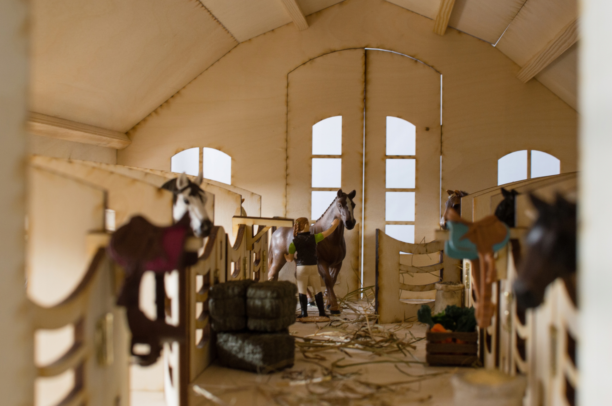 Stajnia posiada wymiary pasujące do klasycznych i najbardziej tradycyjnych figurek koni np. firmy Schleich. Do każdego budynku stajni jest możliwość dokupienia kompletu widocznych na zdjęciach drewnianych płotków z których można ustawić wybieg dla koni i przeszkód.