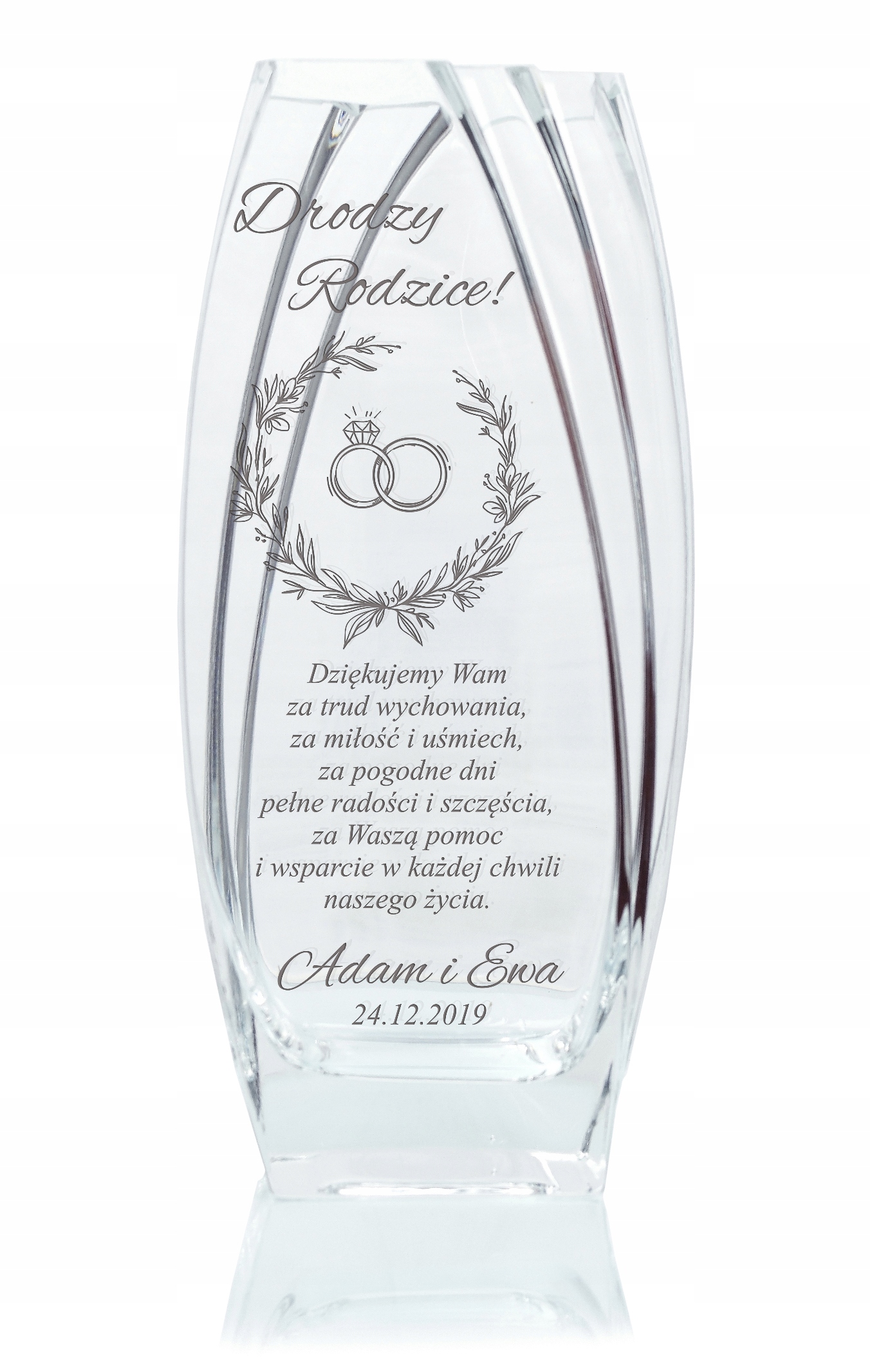 Przedstawiamy ozdobny szklany wazon z grawerem, który dzięki swojemu oryginalnemu wykonaniu ma niepowtarzalny design. Prezentowany produkt to świetny sposób, aby wyrazić swoje podziękowanie dla bliskich z okazji dnia ślubu. Wazon idealnie sprawdzi się również jako upominek z okazji rocznicy ślubu, odejścia na emeryturę czy prymicji.