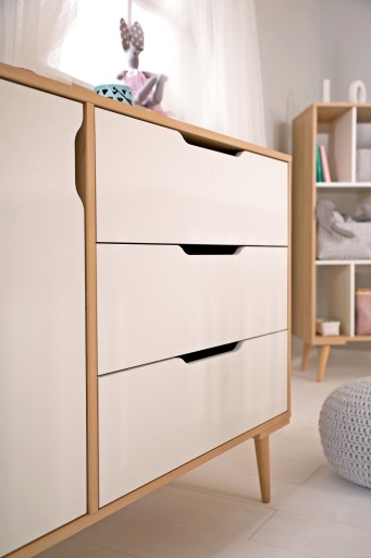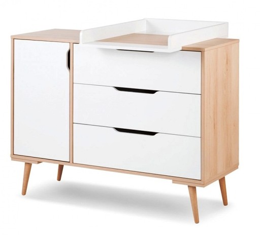 Комод SOFIE - це поєднання сучасного дизайну та функціональності. Поєднання білого і букового відтінку радує око навіть найвибагливіших людей. Полиці, що замикаються, і три містких ящика стануть підмогою для багатьох новоспечених мам. Комод SOFIE також сумісний із пеленальним майданчиком, який може виявитися безцінним на ранніх етапах життя дитини.