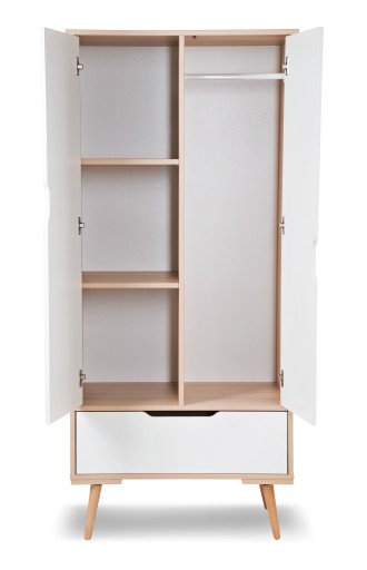 Дводверна шафа Sofie дуже функціональна, має з одного боку великий простір між полицями, що дозволяє чітко розставити одяг вашої дитини. З іншого боку шафи є штанга для підвішування одягу, а внизу шафи є дуже місткий ящик.