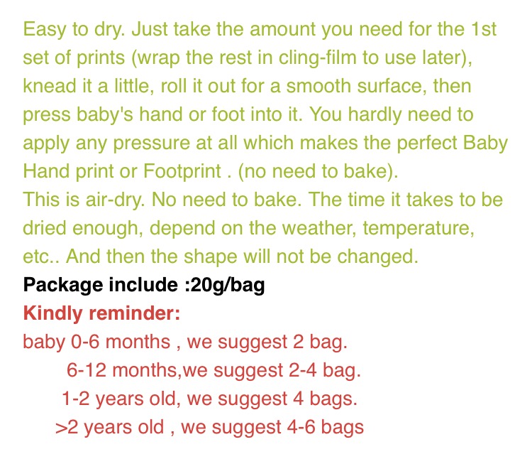 Produkt bezpieczny dla dziecka. Prosty i szybki w wykonaniu - żadnego wypiekania odcisku, żadnych dodatkowych wymaganych materiałów, wystarczą tylko 2 minuty, aby stworzyć unikalną pamiątkę. Masę należy rozpakować, uformować w porządany kształt i odbić rączkę lub stopkę dziecka. Następnie odstawić do wysuszenia.