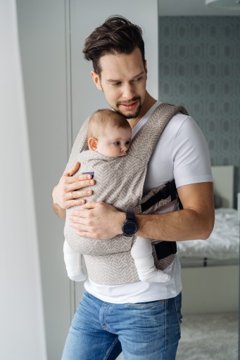 • ергономічна панель підтримує спину дитини, дозволяючи розмістити її в анатомічному положенні, а ніжки утримуються в положенні М (жаба), що впливає на правильне формування тазостегнових суглобів