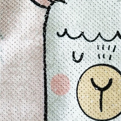 - Сумка / рюкзак виготовлена з матеріалу з різнокольоровими блискітками з зображенням малюнка з одного боку і білого матеріалу з іншого боку.