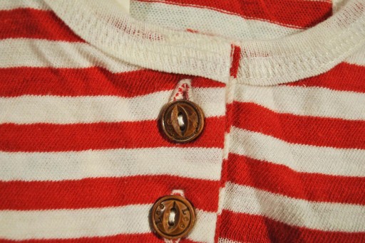 Топ для дівчинки застібається на два гудзики. У нижній частині лицьової частини розміщена табличка з логотипом виробника. Блузка в біло-червону горизонтальну смужку.