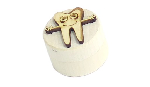 Пропонуємо пам'ятну круглу коробочку на перший зубок нашої дитини, з декором усміхнений зубок.