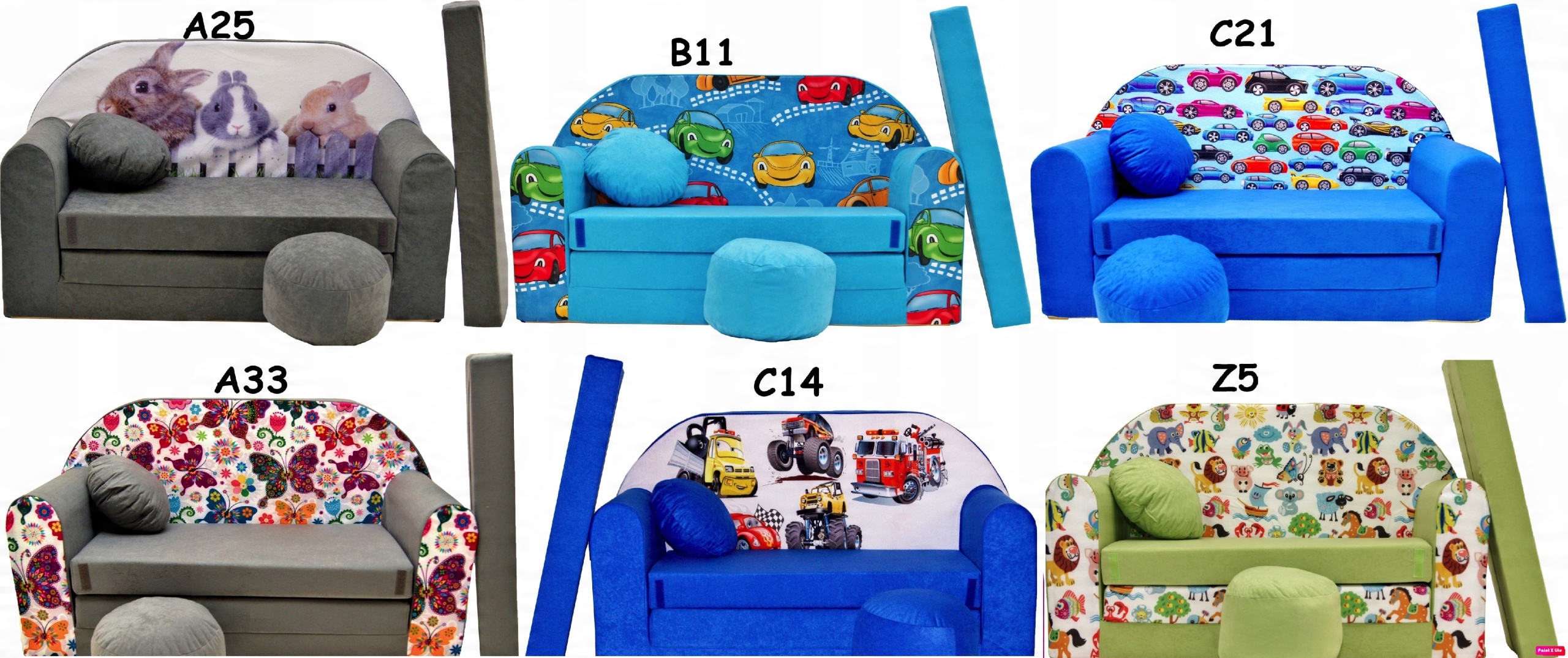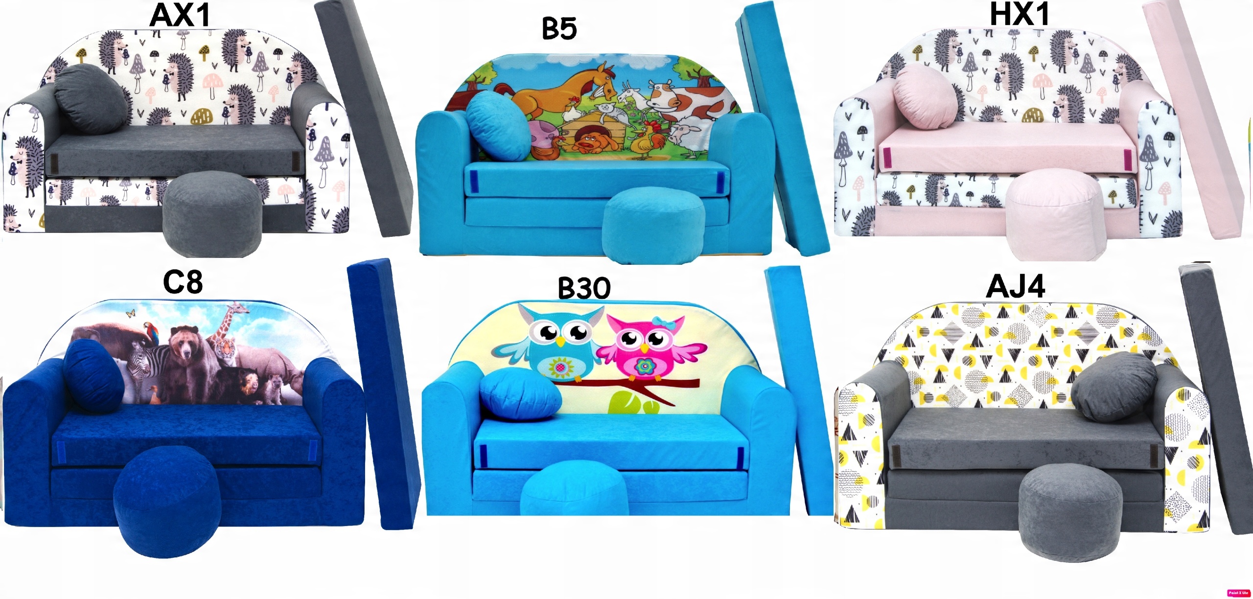 KAŻDY ZESTAW ZWIERA SOFĘ, DODATKOWĄ PODUSZKĘ, JASIA oraz PUFĘ.