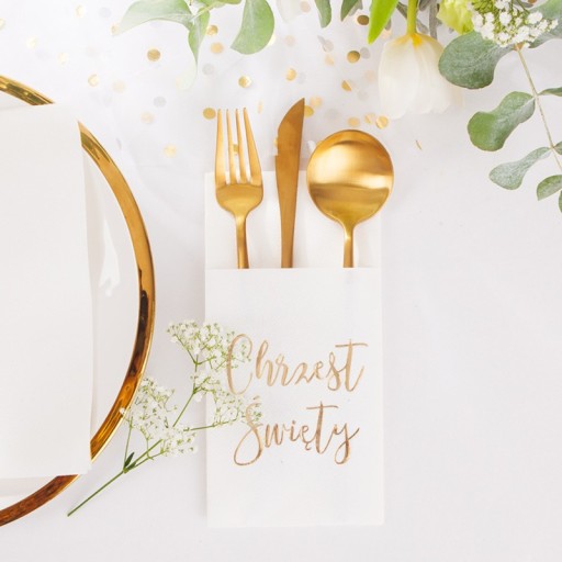 - паперові кишеньки для столових приладів білого кольору, прикрашені золотистим мерехтливим написом Святе Хрещення сучасним шрифтом