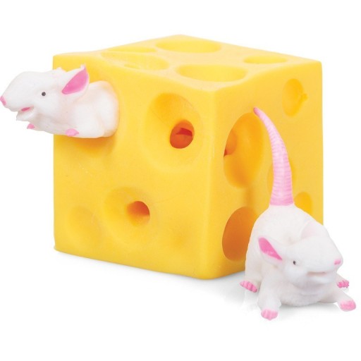 Дуже реалістична іграшка складається з3 окремихелементів, де основна частинакубсиржовтийз довжиною сторони близько 5 см. Куб тримаєтьсяотворив яку можна вставити2 білі мишкивходить в комплект. Всі елементи, що входять до складу іграшки єдужееластичнийіміцний. Мишки і сир можнарозтягуватись.