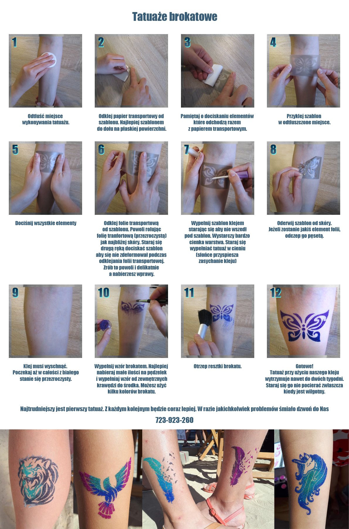 Zmywanie: klej można zmyć naszym odtłuszczaczem lub czymkolwiek co ma w sobie alkohol. Polecamy również ściereczki do demakijażu. Tatuaż brokatowy jest wrażliwy na ścieranie po długotrwałym namoczeniu w wodzie. Zalecamy nie pocierać go niczym do póki samoistnie nie wyschnie.