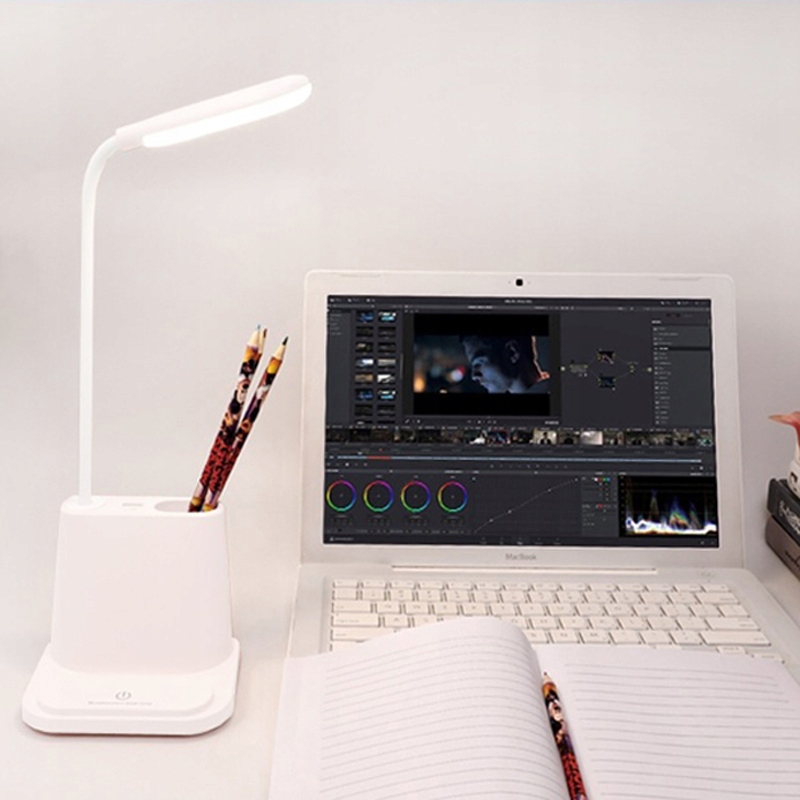 Lampka wyposażona jest w przybornik na materiały biurowe takie jak: długopisy, cienkopisy flamastry itp. Będzie idealnie wspomagać Cię w czasie nauki i pracy.