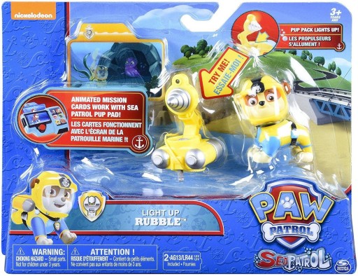 Фігурка із щебеню із серії Sea Paw Patrol від Spin Master. Набір включає: фігурку Rubble, рюкзак зі світловими ефектами та 3D-картку місії.