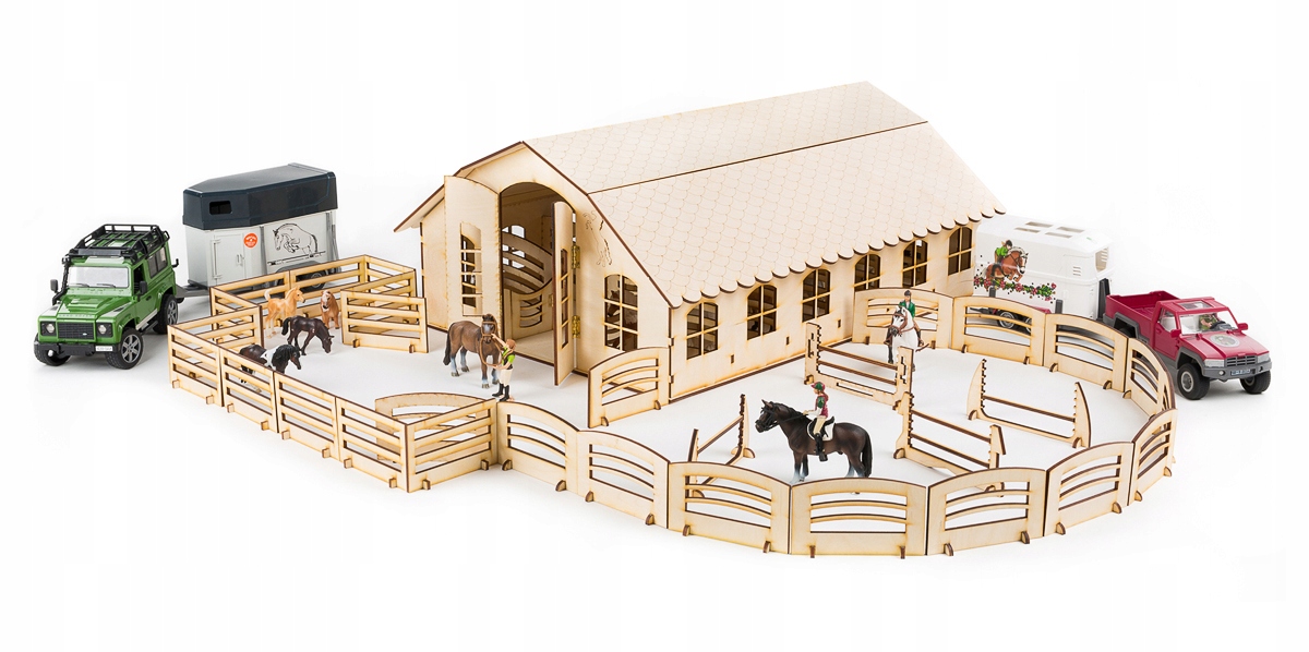W stajni znajdują się trzy boksy oraz żłoby z zielonym filcem do wyłożenia. Po wprowadzeniu konia do boksu można go zamknąć ruchomymi drzwiczkami z wzorami koni. Dach stajni zdobi grawerowana dachówka, a ściany budynku - ciekawe rysunki kwiatów i zwierząt. Przed stajnią montuje się obszerny padok, na którym dziecko może przygotować parkur z trzema przeszkodami. W zestawie znajdują się również trzy drewniane koniki na stojakach, instrukcja oraz klej do drewna.