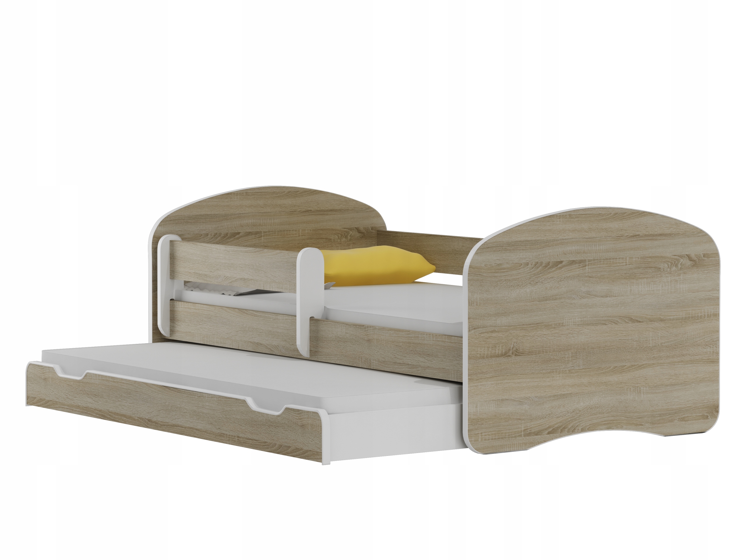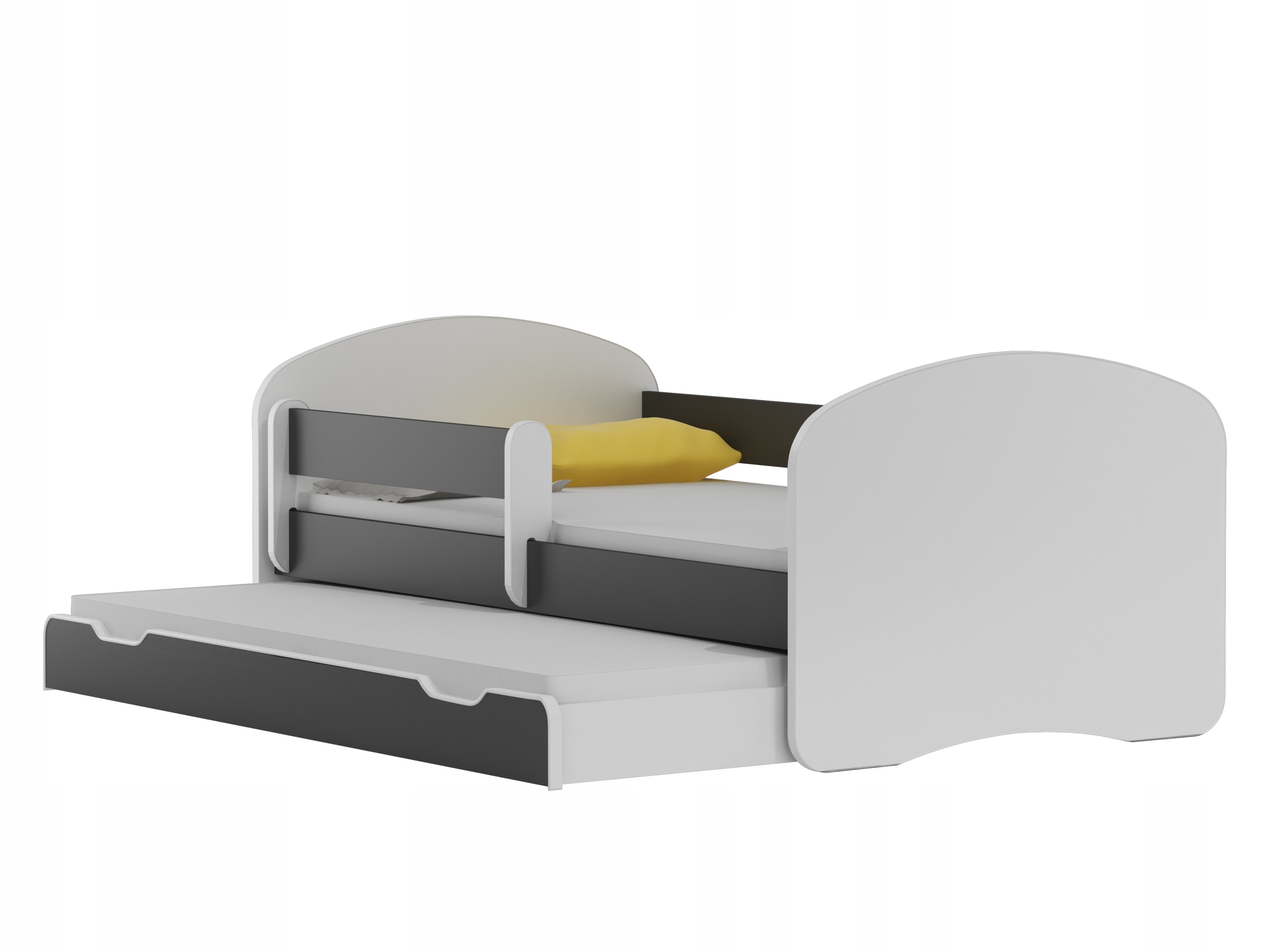 - posiada szufladę, w której znajduje się drugi stelaż oraz materac. Szuflada zamontowana jest na 6 gumowych kółkach, dzięki czemu nie rysuje podłogi podczas wysuwania