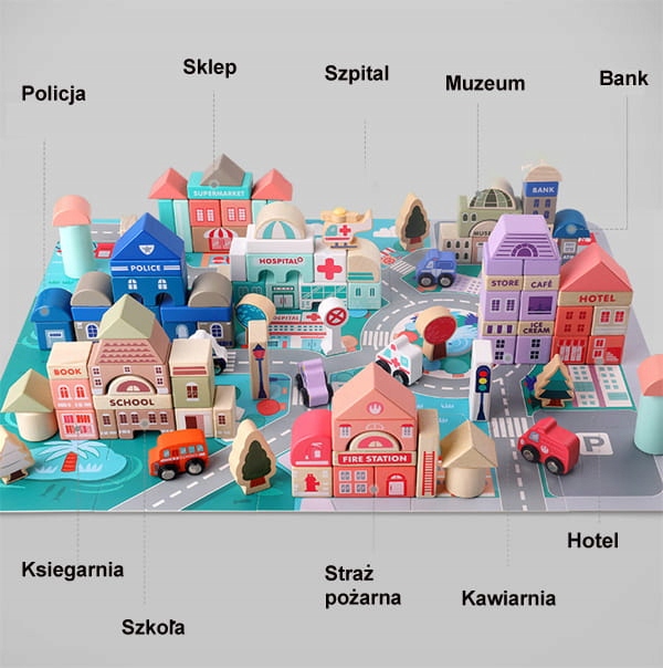 - BUDYNKI składane z wielu elementów : komisariat policji, sklep, szpital, muzeum, bank, księgarnia, szkoła, budynek straży pożarnej, kawiarnia, hotel