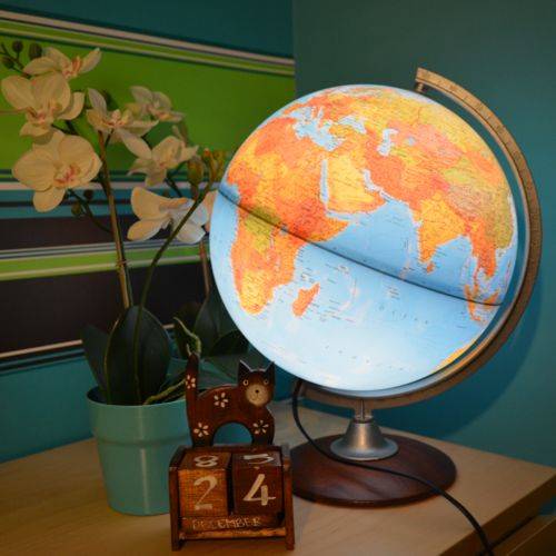 Це задоволення для любителів традиційної красивої форми блакитного кулі. Особливою пізнавальною привабливістю є те, що при виділенні на фізичній карті додаткова інформація з'являється у вигляді політичної карти. Стримане освітлення надає кімнаті, вітальні або спальні позачасовий стиль, підкреслюючи гармонійність кімнати. Завдяки цьому його можна використовувати як оригінальний світильник, який заколисує вас мріями про подорожі.