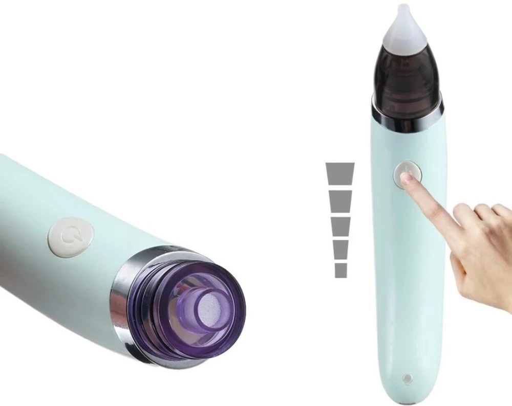 5. Włóż końcówkę do przewodu nosowego i włącz urządzenie (wciśnij raz przycisk na obudowie urządzenie zacznie zasysać, wciśnięcie 2-5 razy spowoduje zwiększenie siły ssania. 6 naciśnięcie wyłącza urządzenie.
