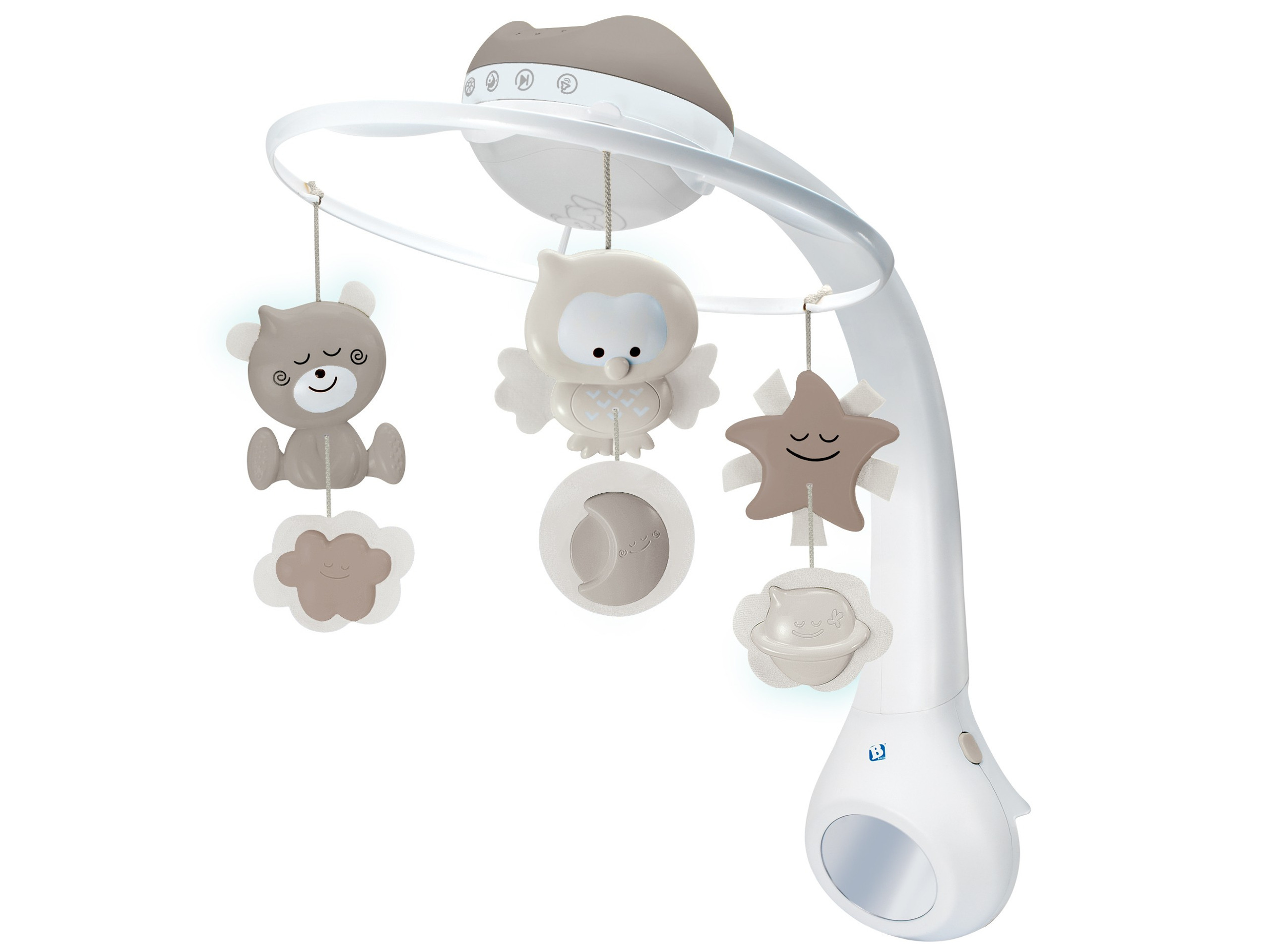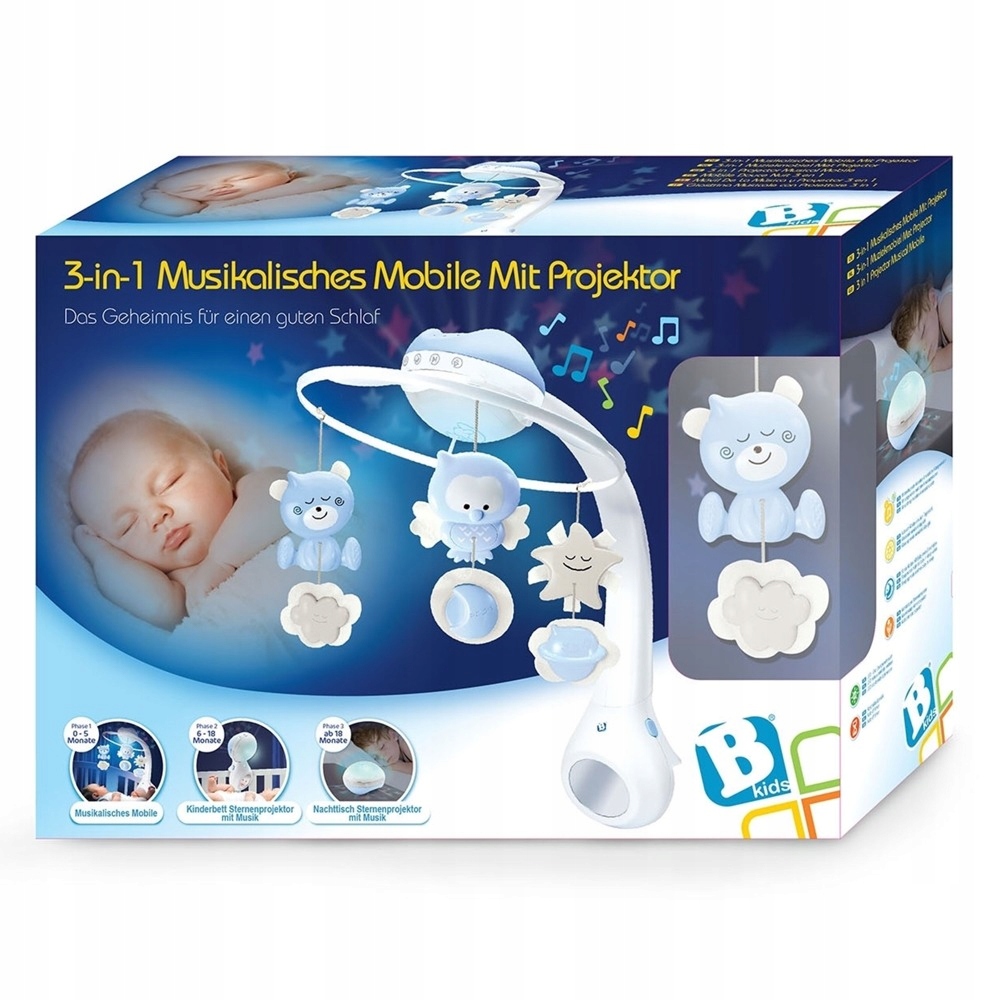 - Kiedy dziecko osiągnie 3-6 miesiąc życia zabawka oferuje lekki projektor do zamontowania na łóżeczku, który emituje subtelne dźwięki oraz generuję gwieździsty wzór na ścianie.