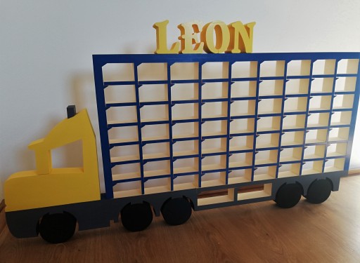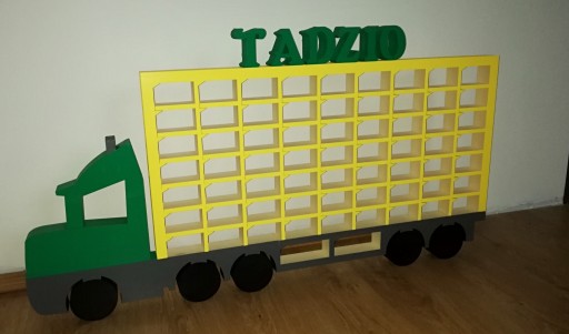 Вантажівку можна пофарбувати фарбою з балончика або пензликом (тільки фарбою без розчинника). Найкраще приклеїти автомобіль до стіни акриловим скотчем або використовувати двосторонній скотч тільки з поролоном, тоді автомобіль буде стійким і витримає вагу машин. Вантажівка виготовлена зі стиродуру. Матеріал твердіший за пінополістирол, хоча він і не такий твердий, як фанера.
