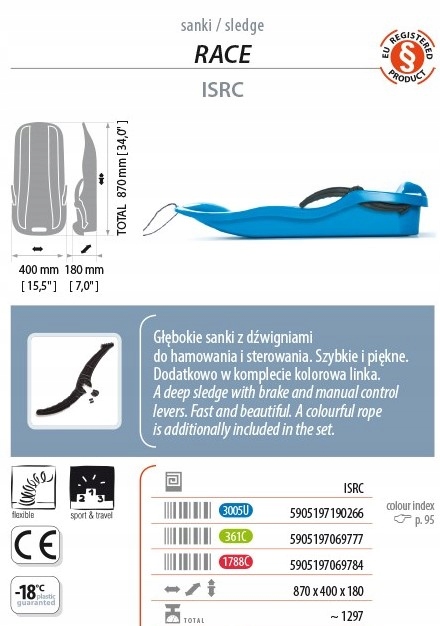 Głębokie sanki plastikowe z dźwigniami do hamowania i sterowania.