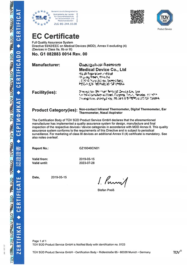 Termometr jest urządzeniem medycznym certyfikowanym przez niemiecką firmę TÜV SÜD Product Service GmbH.