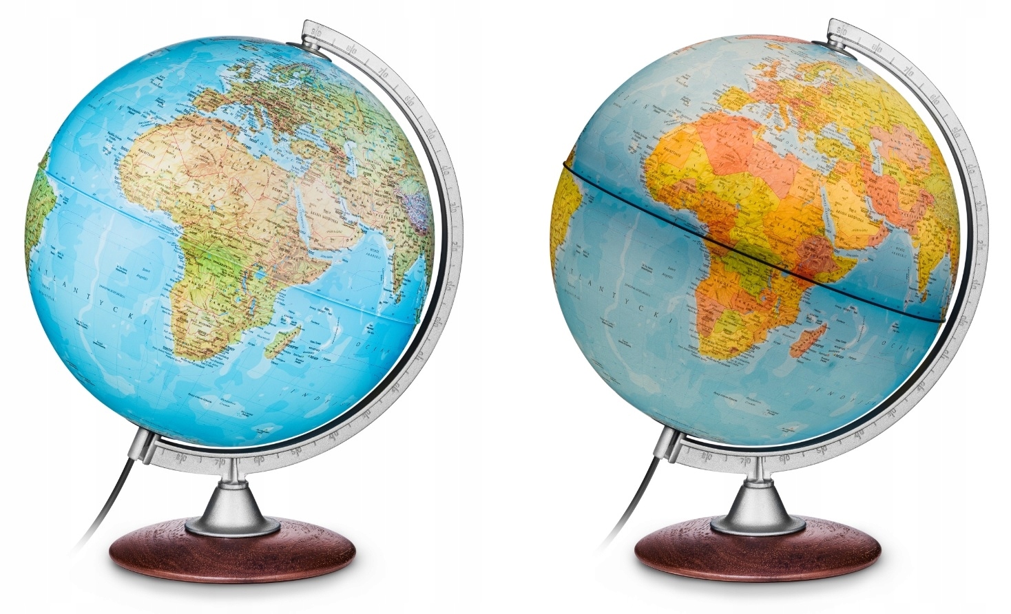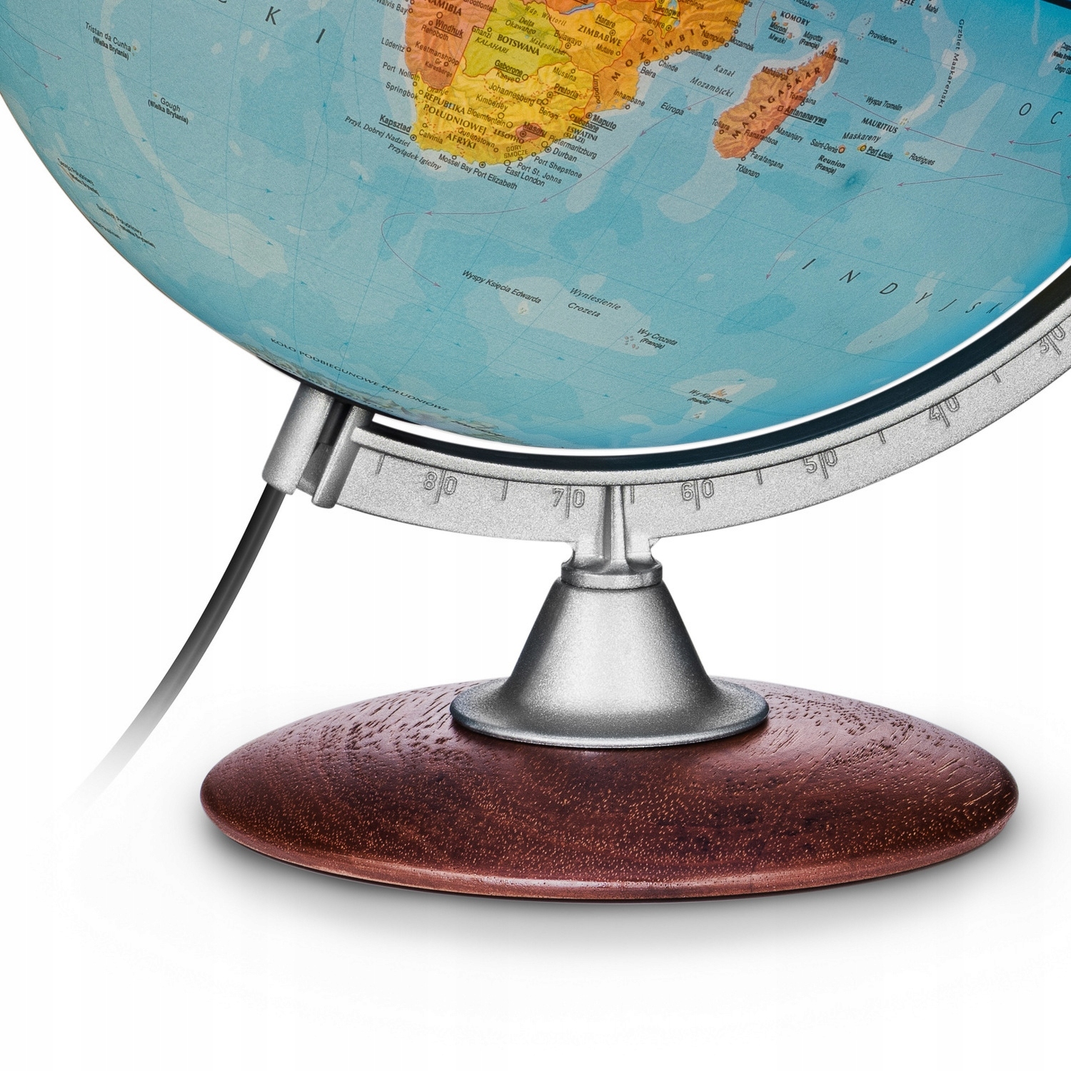 Oto gratka dla miłośników tradycyjnej pięknej formy „niebieskiego” globusa. Szczególną atrakcję o walorach poznawczych stanowi fakt, że po podświetleniu na mapie fizycznej pojawiają się dodatkowe informacje w postaci mapy politycznej. Dyskretne podświetlenie nadaje pokojowi, salonowi lub sypialni ponadczasowy styl, podkreślając harmonię pomieszczenia. Dzięki temu może posłużyć jako oryginalna lampka, wprowadzając Cię w sny o podróżach.