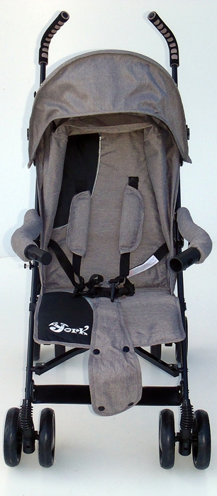 Wózek posiada pięciopunktowe pasy bezpieczeństwa z dodatkowym pasem krokowym oraz rozpinaną przednią barierkę.