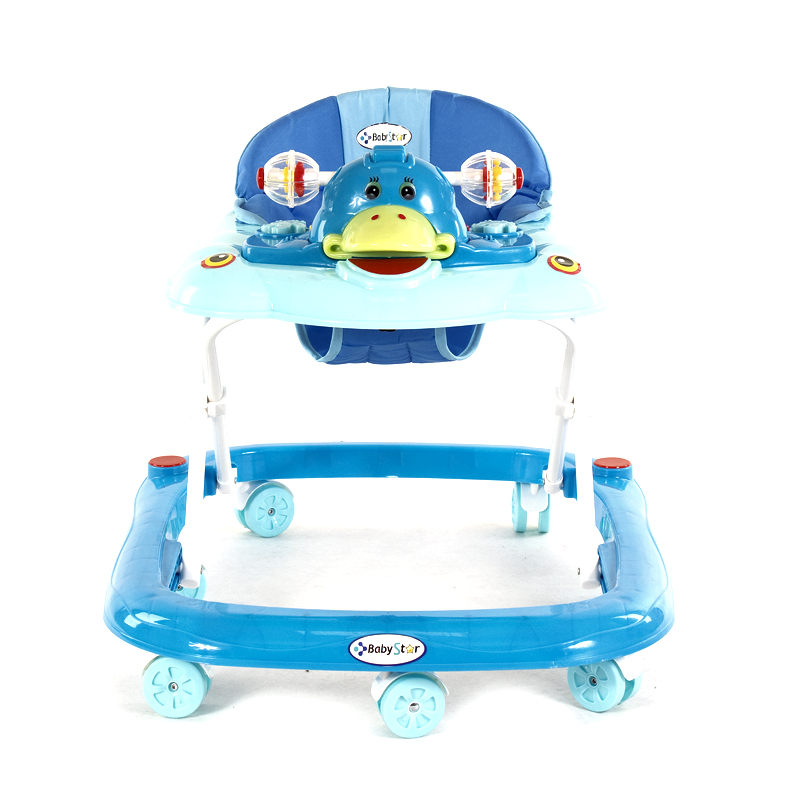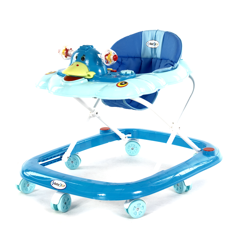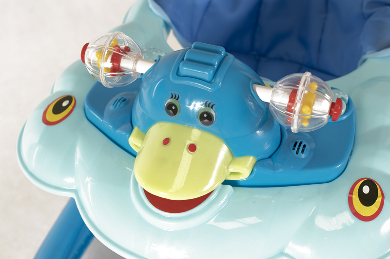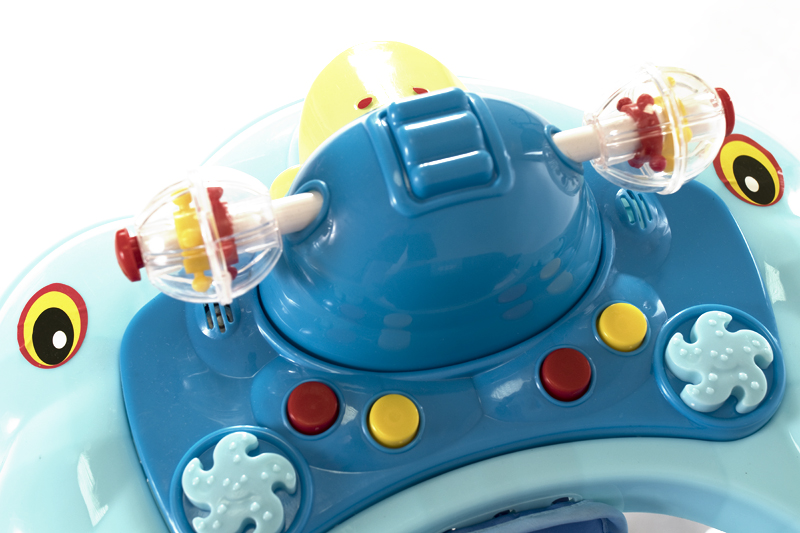 - chodzik posiada przyciski włączające muzykę ( 4 przyciski - 10 melodii) oraz pokrętła grzechotki,