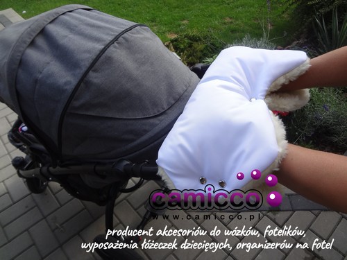 Манжетка виготовлена з водонепроникного коляскового матеріалу, наповнена щільною ватою, зсередини оброблена приємною на дотик вовною, яка зігріє під час прогулянок, підходить для більшості колясок і санок.
