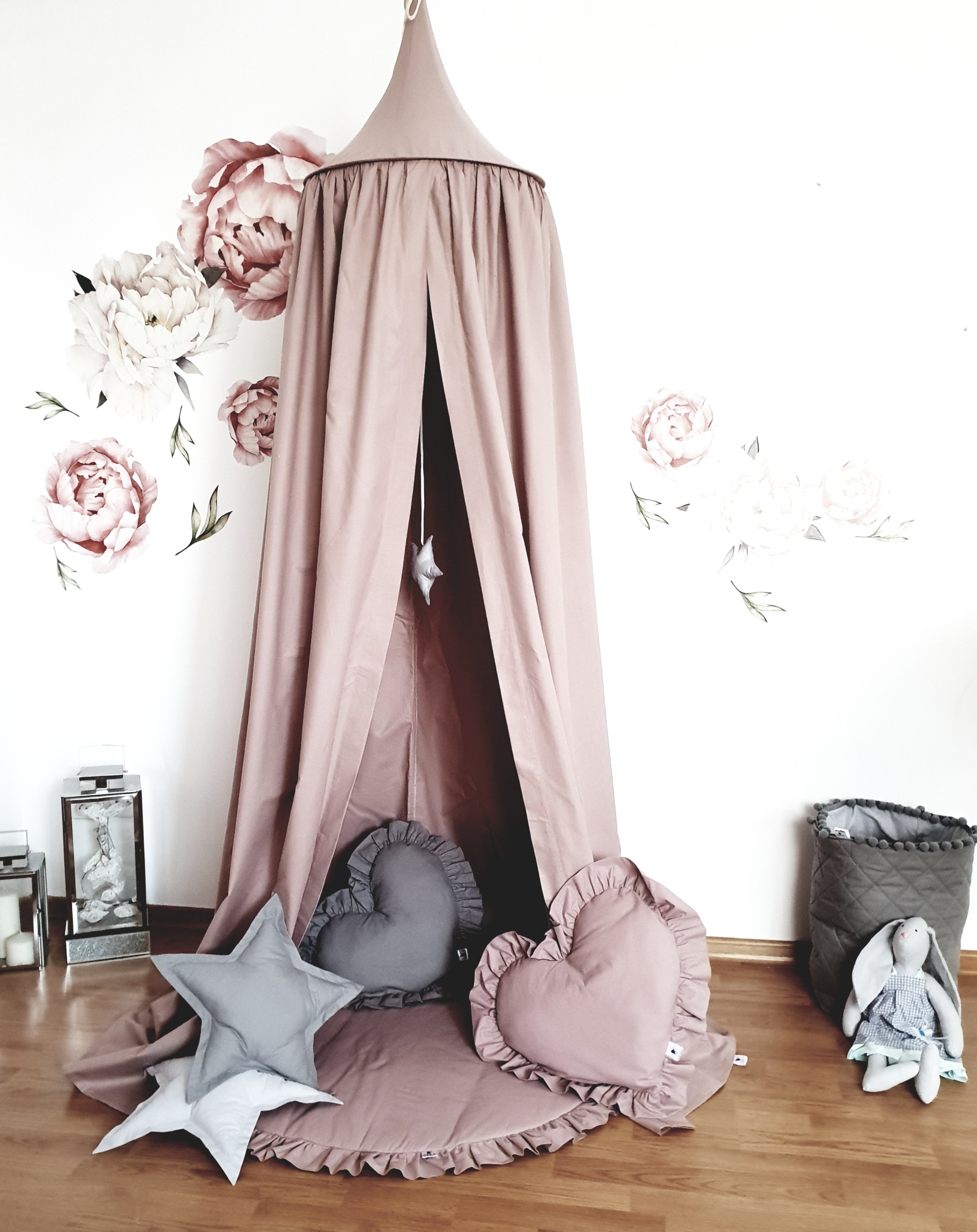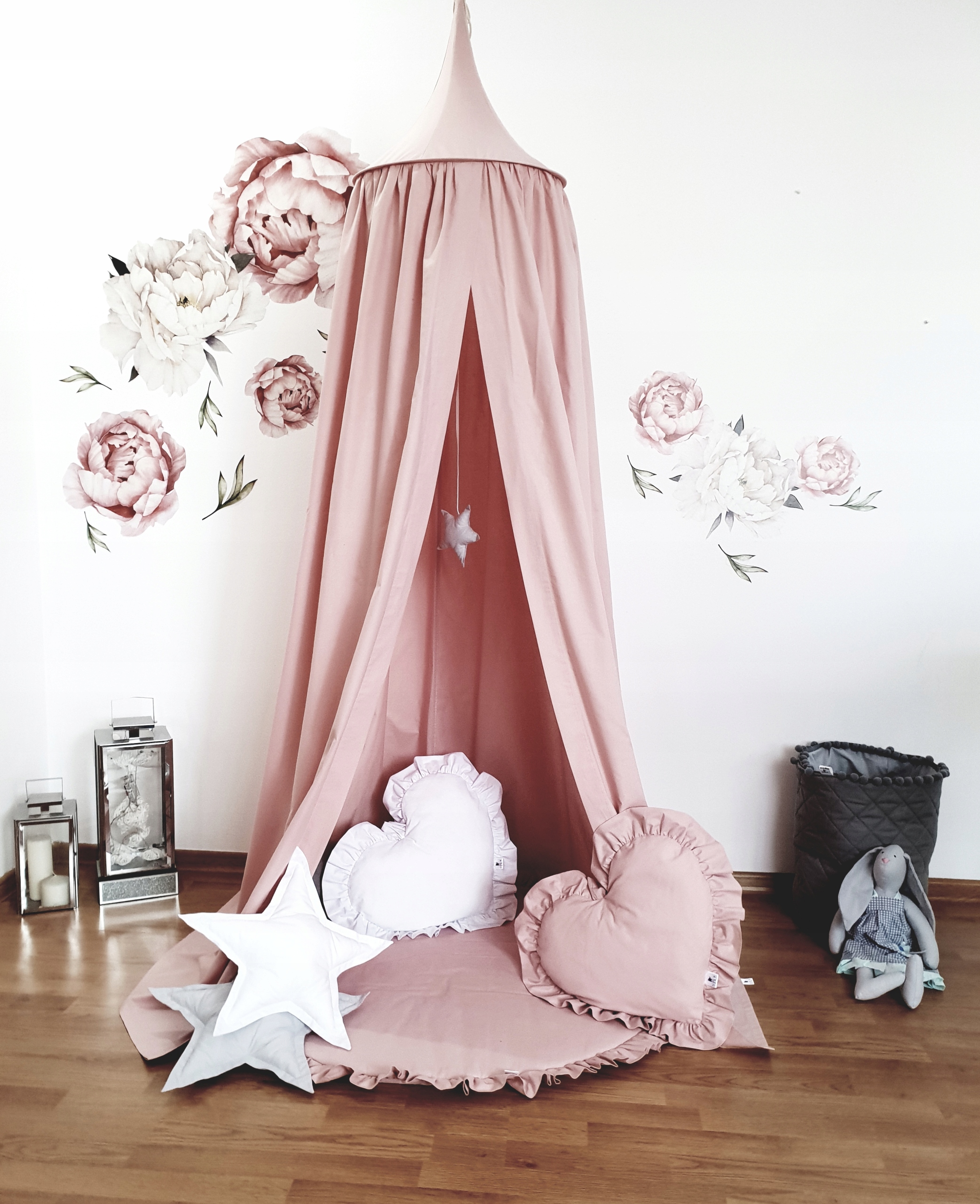 Baldachim to niezwykle efektowna ozdoba pokoju dziecięcego, miejsce do zabawy oraz wypoczynku. Zawieszony nad łóżeczkiem niemowlaka, wytłumi hałas oraz ochroni przed nadmiarem światła później posłuży jako strefa zabawy i wypoczynku w pokoju przedszkolaka. Znakomicie sprawdzi się w niewielkim pokoiku gdyż nie zajmuję wiele miejsca. Wewnątrz szczytu można przymocować dekoracje, ozdobne lampki.