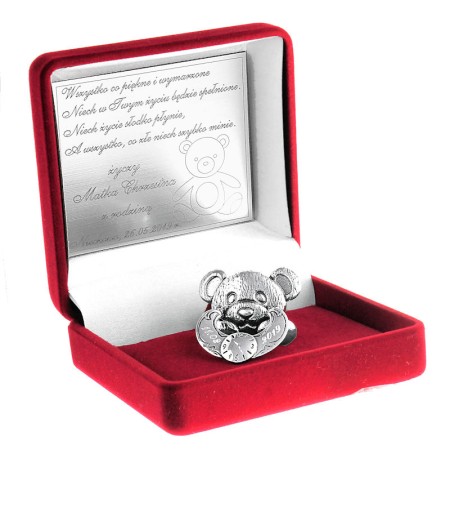 Срібний ведмедик на хрещення з гравіюванням і присвятою в декоративній коробці