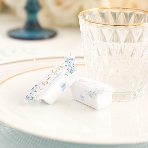 Смачна традиційна помадка в красивому графічному дизайні з персоналізацією.Помадка упакована в красиву синю упаковку з мотивом дитячої коляски. На передній частині цукерки є місце для персоналізації. Це чудова ідея для солодкого подарунка для гостей. Тематика коляски дозволить створити цілісне оздоблення з іншими виробами з колекції «Блакитна коляска».