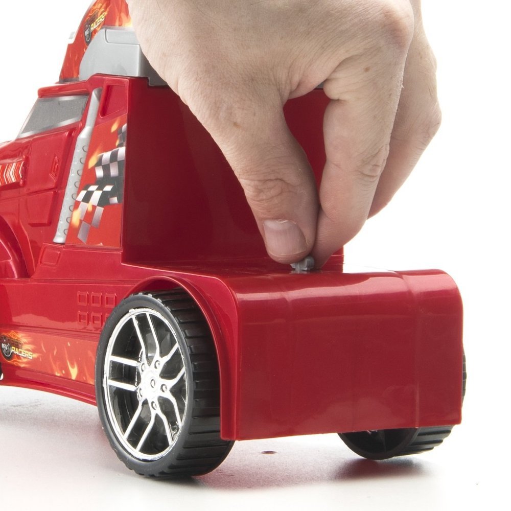 Oprócz lawety z miejscami przewozowymi dla resoraków tir posiada również wyrzutnię! Wystarczy wsunąć autko w specjalny właz wjazdowy umieszczony na dachu i obserwować jak autka z dużą prędkością opuszczają front pojazdu. Jest to idealny mechanizm pozwalający zdobyć przewagę w szalonym wyścigu.