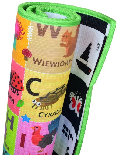 Кольорова сторона килимка використовується для вивчення літер алфавіту на основі милих тварин та їхніх назв. Алфавіт містить усі польські літери, а тварини з усього світу обов’язково викличуть у дитини цікавість і стануть елементом спільної пізнавальної розваги.