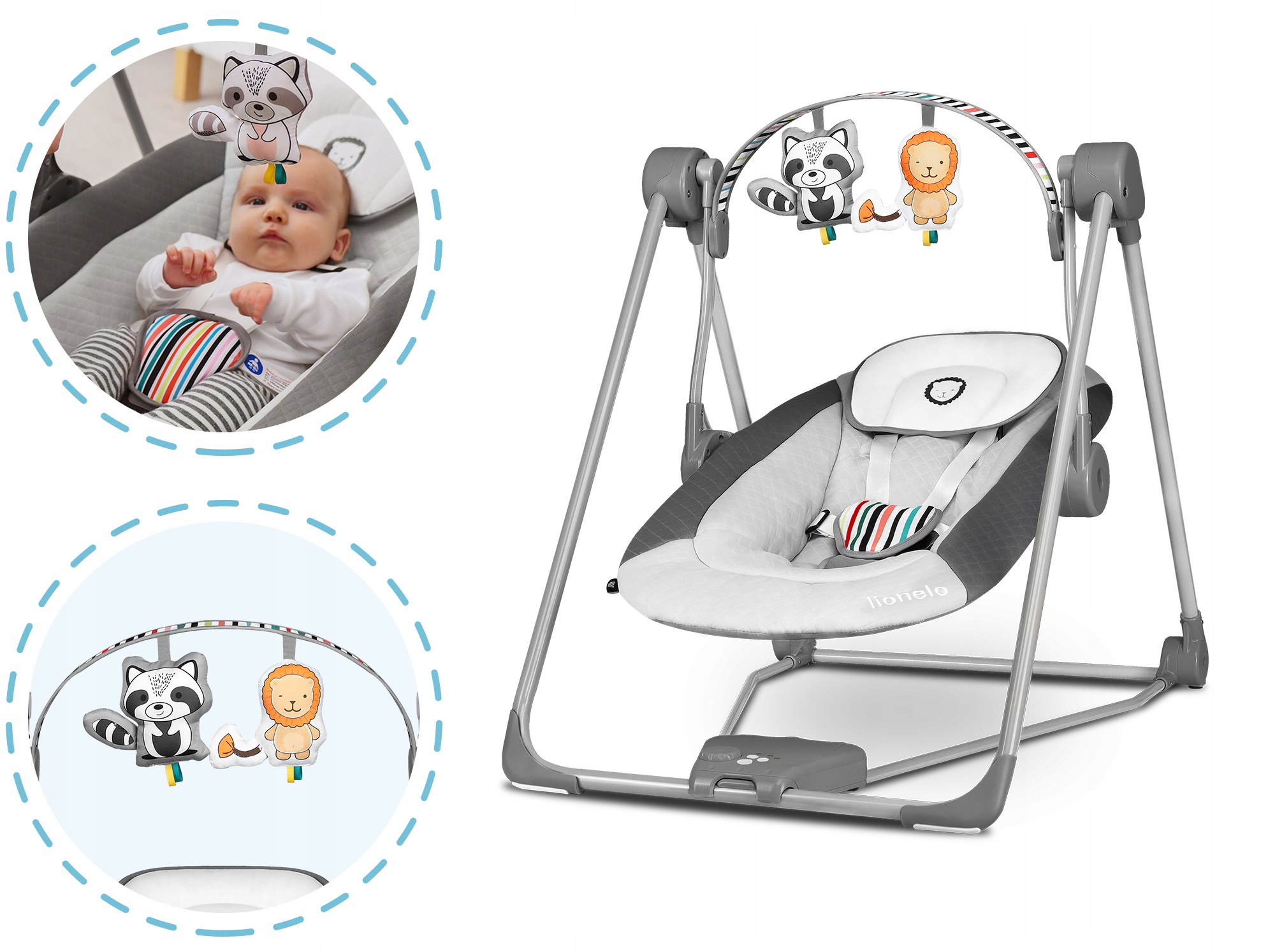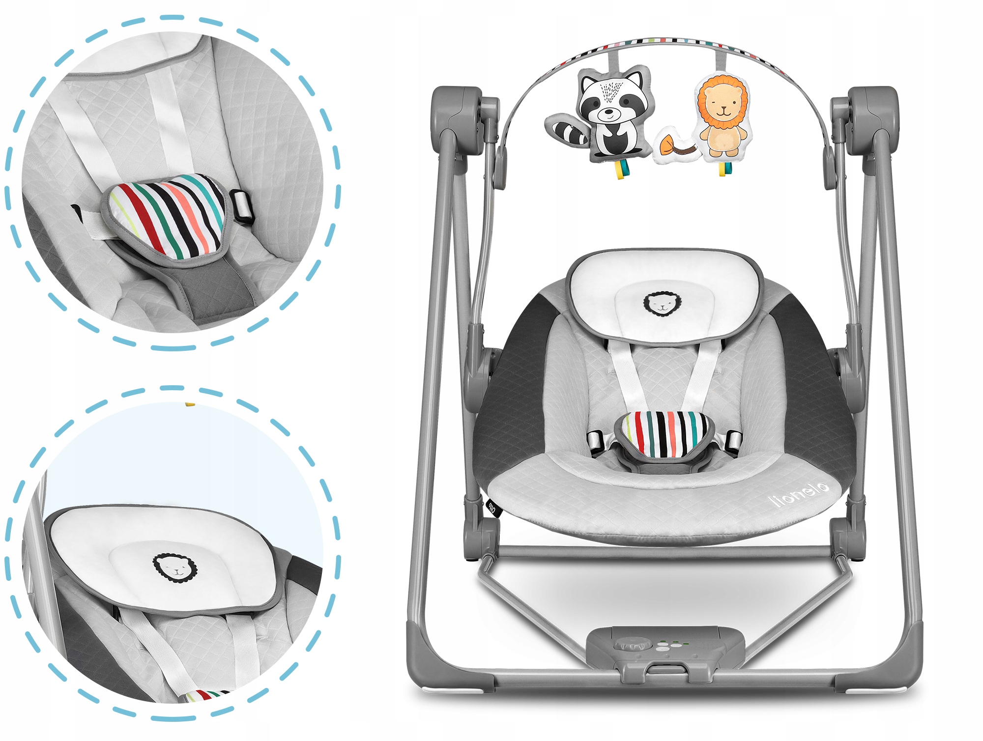 ШЕЗЛОНГ СКЛАДЫВАЮЩИЙСЯ ОЧЕНЬ КОМПАКТНО, ПОДНОЖКА КАЧЕЛИ LIONELO ОТТО + ИГРУШКИ