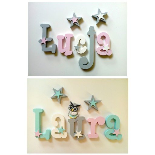 У продажу є красиві літери з фанери, розписані вручну та прикрашені тонкими прикрасами, які ви можете створити з іменем вашої дитини.