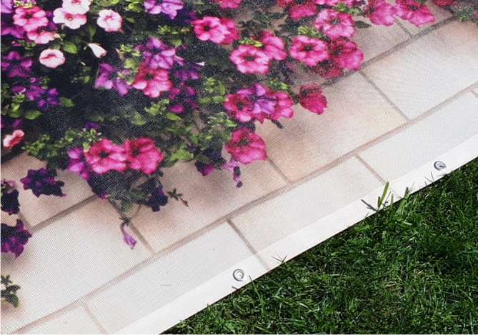 Wszystkie brzegi foto osłony balkonowej wzmocnione są przez zgrzewanie dwóch warstw materiału. Na powstałych krawędziach zamontowane są mosiężne oczka, służące do montażu.