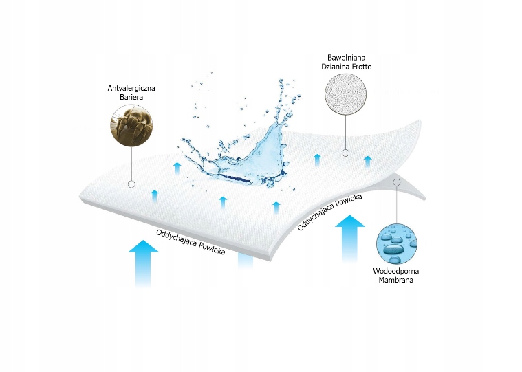 Wykonane z miłej i miękkiej dzianiny. Wierzchnia warstwa to miękki jersey. Spodnia warstwa to delikatna oddychająca paroprzepuszczalna membrana poliuretanowa - nie przepuszcza płynów, chroniąc materac przed zmoczeniem, a dodatkowo stanowi doskonałą barierę zabezpieczającą przed rozwojem bakterii, roztoczy oraz przed alergenami.