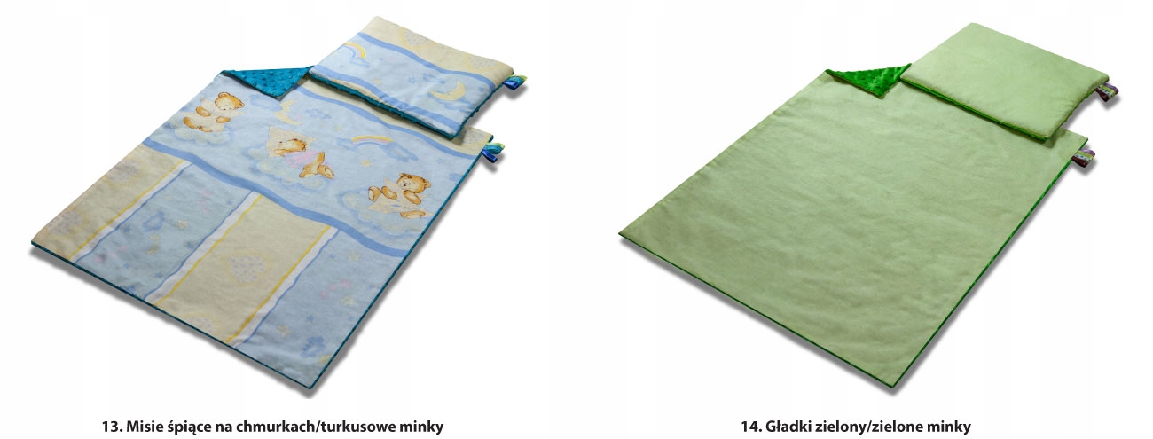 Dwustronna kołderka i poduszka z tkaniny bawełnianej (100% bawełna) i polaru Minky.