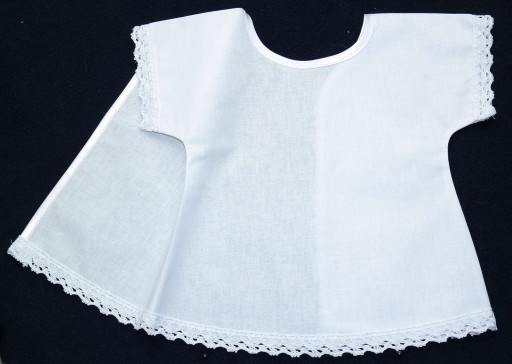- виріз горловини та спина оздоблені білою атласною окантовкою, рукава та низ оброблені білим бавовняним мереживом