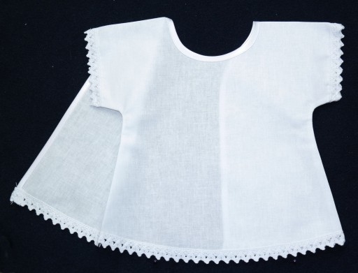 - виріз горловини та спина оздоблені білою атласною окантовкою, рукава та низ оброблені білим бавовняним мереживом
