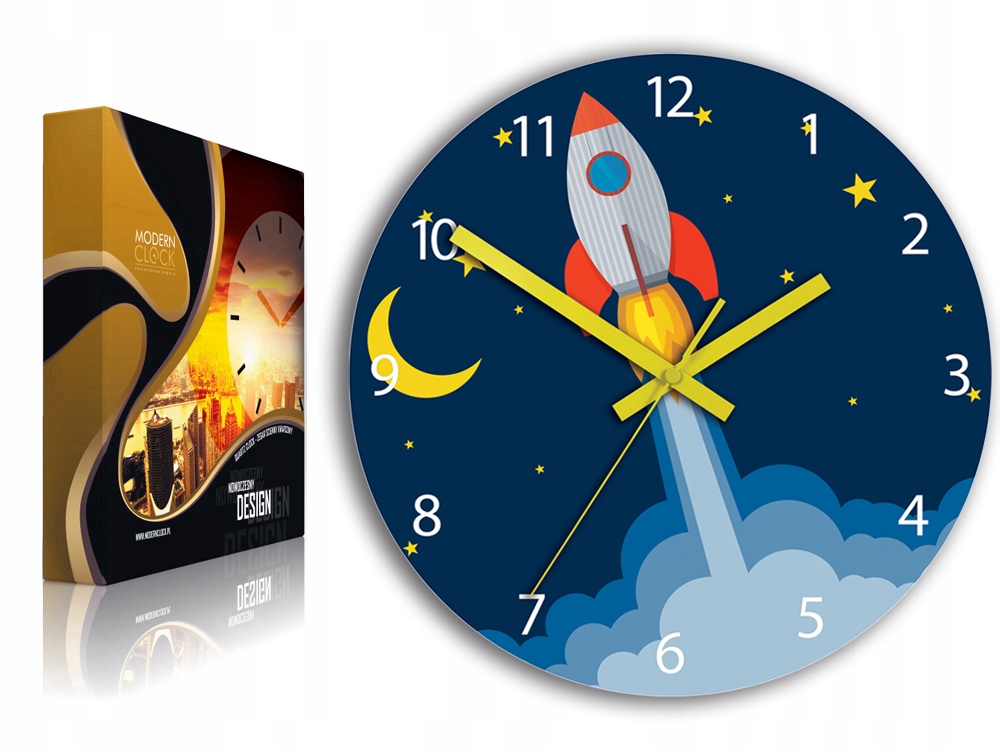 Zegar wykonany ze szkła akrylowego o wysokim połysku, które posiada nowoczesny estetyczny wygląd. Stworzony z myślą o najmłodszych. Z pewnością świetnie posłuży jako dekoracja ścienna w Twoim salonie lub sypialni Twojego dziecka. Świetnie wpasuje się w nowoczesne i klasyczne wnętrza. Zegar zaopatrzony jest w płynący mechanizm kwarcowy, bez efektu tykania. Produkt dobrze odbija światło słoneczne, a dzięki odporności na promieniowanie UV oraz warunki zewnętrze nie wymaga specjalnej konserwacji i bardzo długo utrzymuje swoje właściwości. Na tarczy zegara jest kolorowy nadruk przedstawiający rakietę. Wskazówki są żółte, a cyfry białe. Średnica tarczy wynosi 30 cm. Zapakowany jest w sztywne i eleganckie pudełko, dzięki czemu będzie idealnym prezentem. Montaż zegara jest szybki i wygodny. Tarcza ze wskazówkami jest do zamontowania na haczyk. Elementy dekoracyjne montuje się do ściany za pomocą taśmy montażowej. Produkt pochodzi od polskiego producenta.