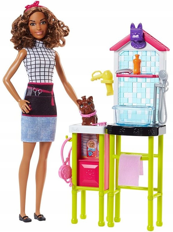 Lalka Barbie z serii "Bądź kim chcesz" wciela się w rolę psiej fryzjerki, stylistki. Odgrywaj sceny w salonie piękności razem z małym pieskiem.