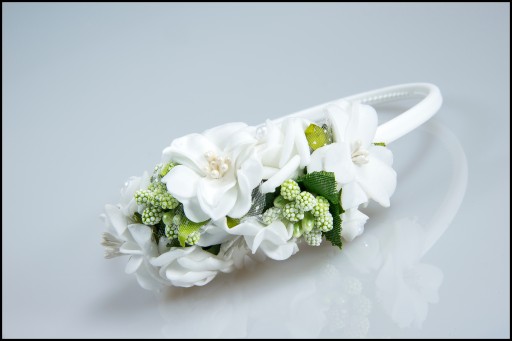 Ефектна пов'язка для причастя з високоякісних спінених троянд. Троянди з пінопласту виглядають дуже природно, а перли додають головному убору елегантності. Ідеально підходить для білого тижня або маскування гірляндами.