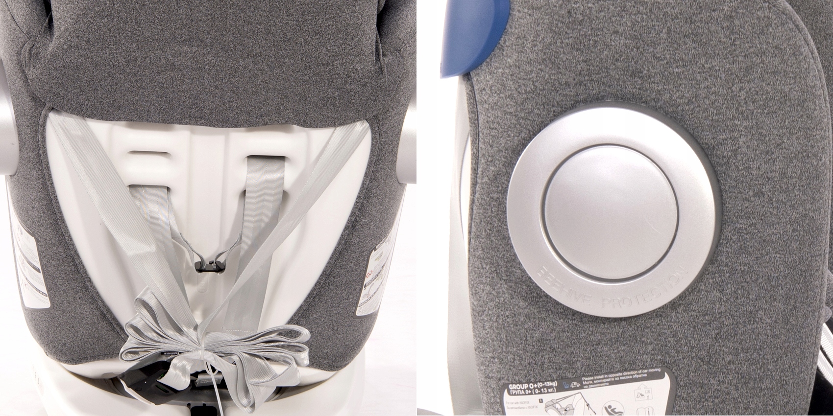 Fotelik został wyposażony we wzmocnienia na po bokach oraz na zagłówku, które dodatkowo absorbują energię uderzenia. Na zagłówku znajduje się również poduszka, która podpiera kark i zabezpiecza główkę dziecka.