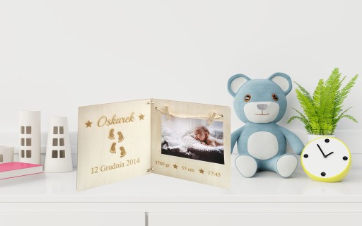 На наступному аукціоні пропонуємо Вам дерев'яну фоторамку формату 15х10 з ім'ям дитини та свідоцтвом про народження. Це ідеальний подарунок на народження дитини, перший день народження, день народження або як сувенір на хрещення. Рамка характеризується джутовими нитками та дерев'яними кліпсами, з гравіюванням свідоцтва про народження дитини!