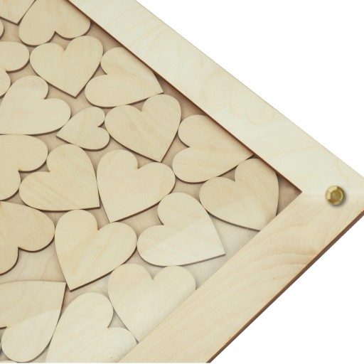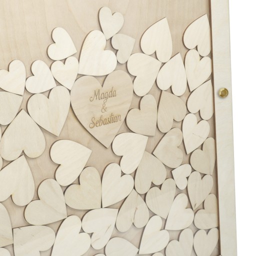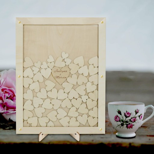 Гостьова книга у вигляді рамки - це модний і сучасний сувенір від гостей на весіллі для подружжя Мода. Каркас виготовлений з міцної та якісної березової фанери, оздоблений склом товщиною 3 мм, прозорим оргсклом. У набір входить 45 великих і 10 менших дерев'яних сердечок, на яких гості будуть залишати різноманітні написи, які будуть нагадувати їм про чудові та щасливі моменти через роки. У центрі - сердечко побільше з іменами пари або будь-яким написом. Рамка чудово виглядає на підставці, що входить у комплект. Все це принесе багато радості як нареченим, так і гостям весілля. Рамка - це чудова прикраса для столу під час весільного фуршету Гостьова книга у вигляді рамки - це фантастична ідея для весілля, завдяки якій можна створити дивовижний і сучасний сувенір.