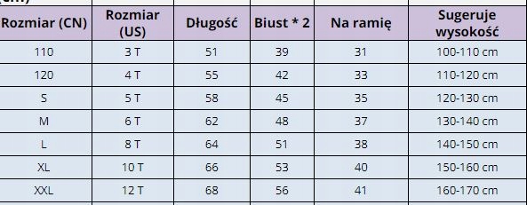 ROZMIAR DOBIERZ NA PODSTAWIE WYMIARÓW Z TABELI OBOK