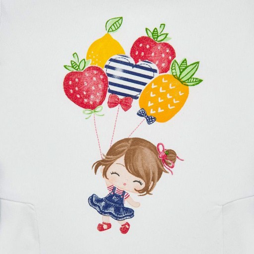 Футболка з коротким рукавом. Круглий виріз. Ззаду застібається на невеликі кнопки, які полегшують одягання. Прикраси: графіка спереду, аплікації у вигляді бантів